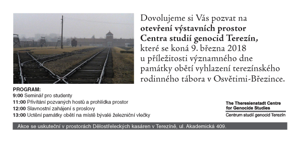 TEREZÍN (27. února 2018) – V pátek 9. března se veřejnosti otevřou výstavní prostory Centra studií genocid Terezín. Symbolicky v den památky obětí vyhlazení terezínského rodinného tábora v Osvětimi-Březince, který je od letošního roku významným dnem České republiky, budou zpřístupněny expozice k tématu genocidního násilí.